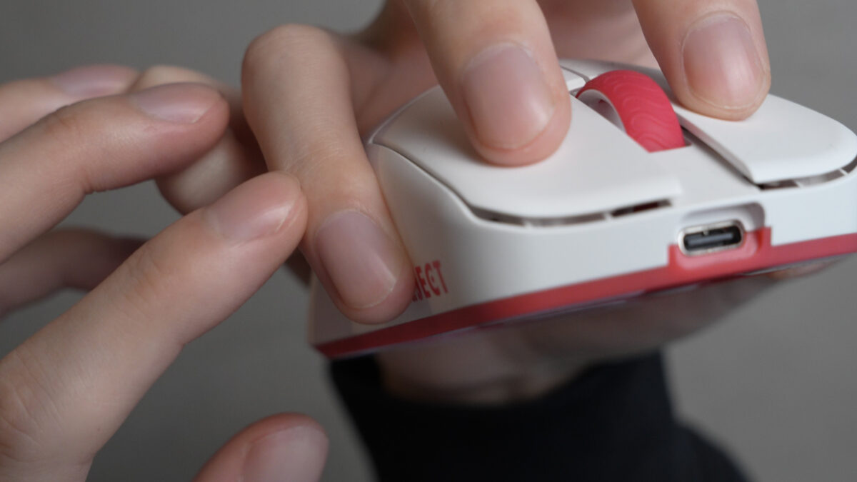 さらに、筆者が受け取った個体は2つとも左右メインボタンにぐらつきが見られました。最近の軽量マウスにしては揺れが大きく、ボタンの感触にも少し影響を与えていると思います。実際に、ボタンを完全に下まで押し込んだときにそのまま指が外側に流れていき、ポストトラベルが実際よりも少し長いように感じてしまいました。